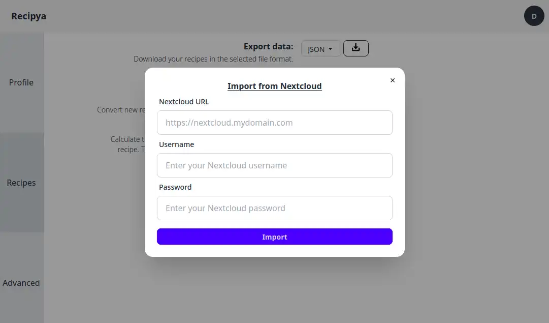 Nextcloud Cookbook is an app for Nextcloud. Follow these steps to import your recipes from a Nextcloud Cookbook instance: