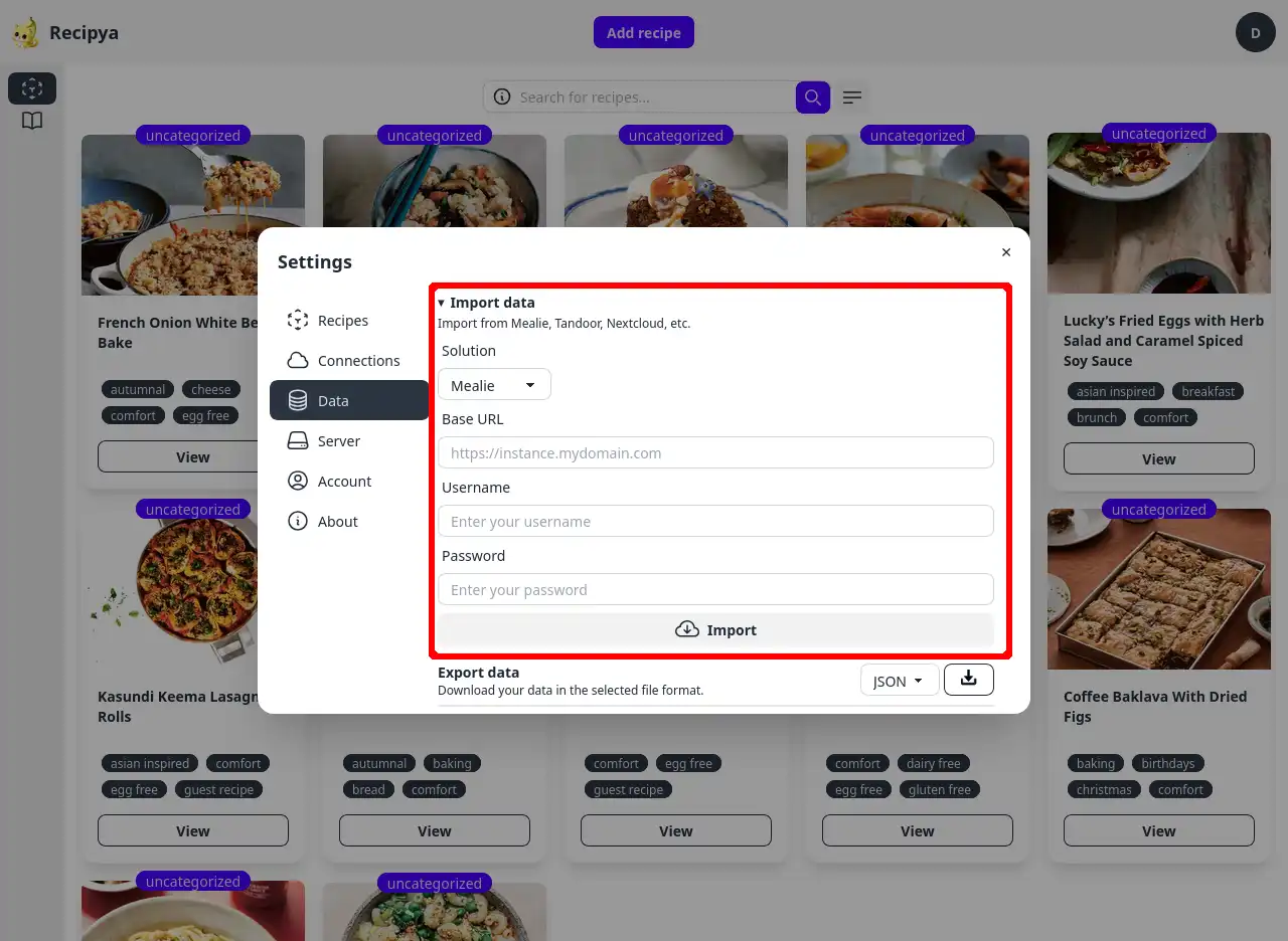 You can import your recipes from Nextcloud Cookbook, Mealie and Tandoor using their respective APIs from the Data tab in the settings. All you have to do is to select the solution you wish to import from, along with its base URL and your credentials.